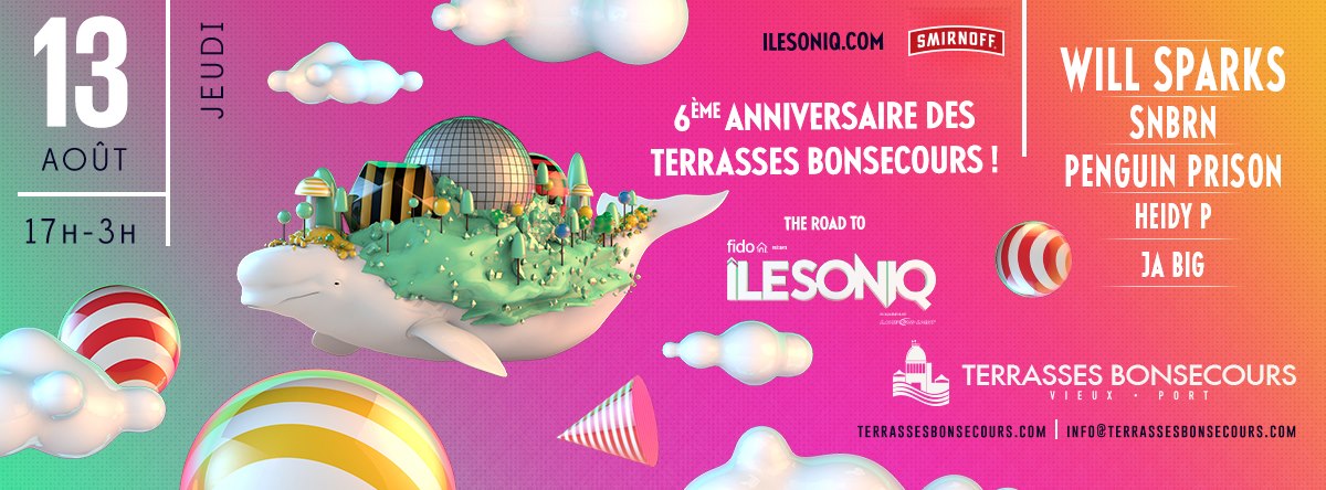 Venez célébrer la 2e édition d’îleSoniq et le 6e anniversaire des Terrasses en compagnie de WILL SPARKS, SNBRN, PENGUIN PRISON, HEIDY P et JA BIG, dès 17h et jusqu’à 3am. Capacité limitée, arrivez tôt!